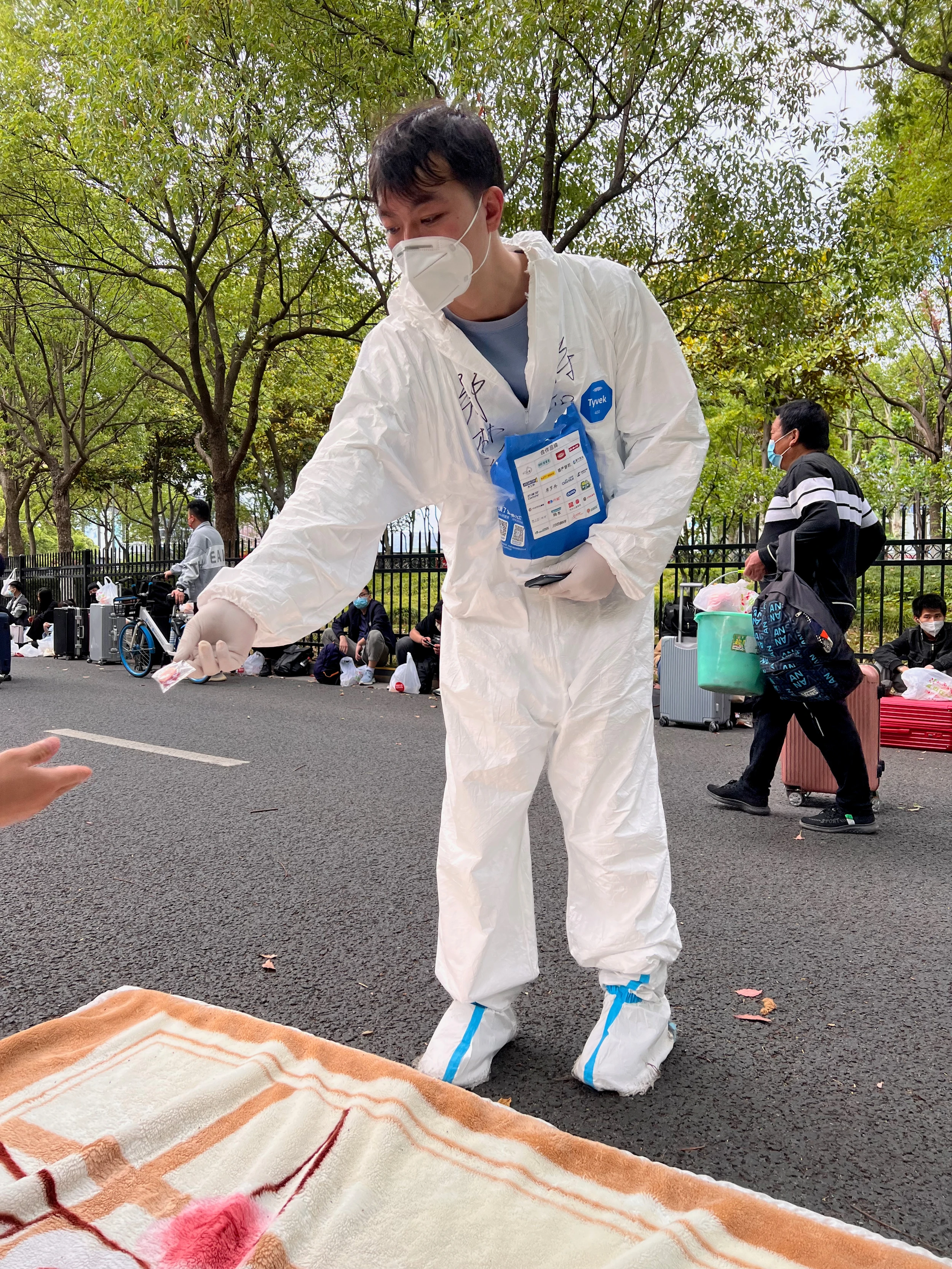 出了站,在进候车厅的队伍旁边,志愿者给每人发了一袋食物。如果没有当日车票,暂时不能进站,需要去滞留乘客集中的一块地方。滞留区入口有辆核酸采样车。有些等待的乘客如果核酸快要过期,可以在这重新检测。
